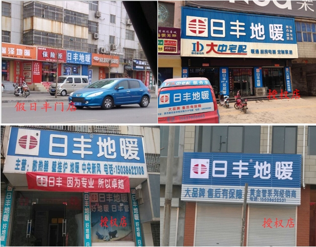 如下為真假日豐門頭對比,大家仔細看就能辨別真?zhèn)危跈?quán)店的門招藍色部分一律是“標志 日豐地暖”,而且不會打與品牌無關(guān)的字樣,其他字樣一般打在下面白色部分,要求門招上面不允許打任何競品字樣,而且藍色部分與白色部分的比例為2:1